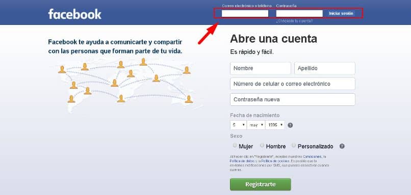 • Avec cette action, nous irons directement sur Facebook. Maintenant, nous devons nous connecter en plaçant notre adresse e-mail et notre mot de passe dans les cases qui le demandent. Ensuite, nous cliquons sur se connecter.