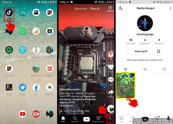 - Il vous redirigera automatiquement vers votre fenêtre de profil. Dans cette section, vous verrez tout le contenu publié et vous verrez même (seulement vous) le contenu restreint. Normalement, ils vous envoient un message pour supprimer les vidéos si elles enfreignent les réglementations en fonction du niveau.