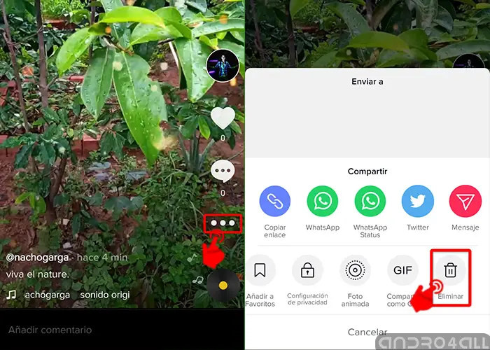 - Trois rangées apparaîtront, la première à partager avec les amis et la famille, la seconde à partager sur les réseaux sociaux et à la fin un menu d’options. Faites glisser avec votre doigt et localisez l’ icône de la corbeille, touchez-la et «Supprimer».