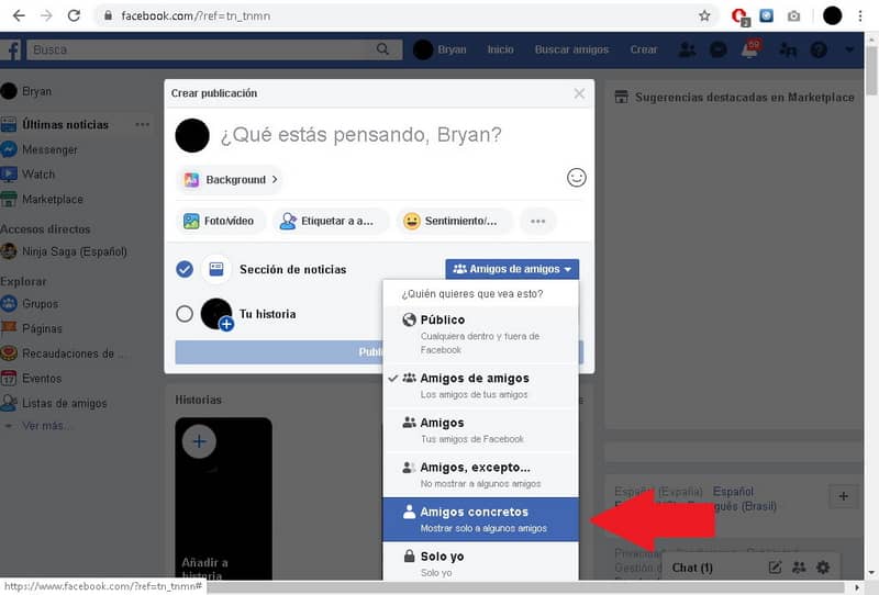 - Cliquez sur la section à quoi pensez-vous…? Dans l’onglet actualités, changez l’option de Public en Amis spécifiques, une option à laquelle vous pouvez accéder en cliquant sur plus …