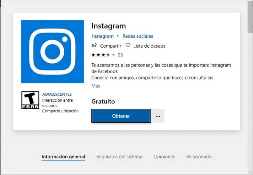 Vous accéderez au Microsoft Store, et dans son moteur de recherche vous devrez taper: «Instagram». À ce moment-là, de nombreux programmes disponibles au téléchargement seront affichés, mais vous ne sélectionnerez que celui montré dans l’image ci-dessus, c’est-à-dire la version officielle d’Instagram pour PC .