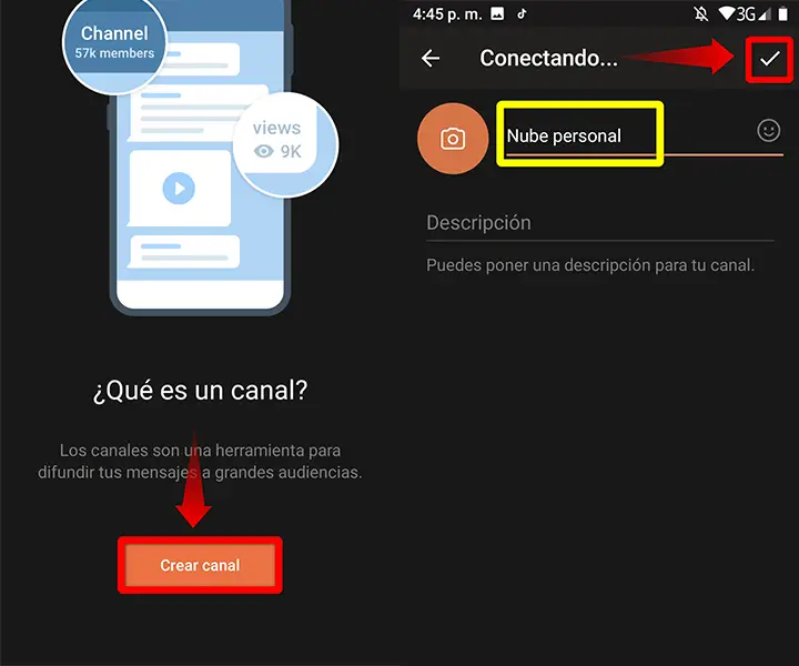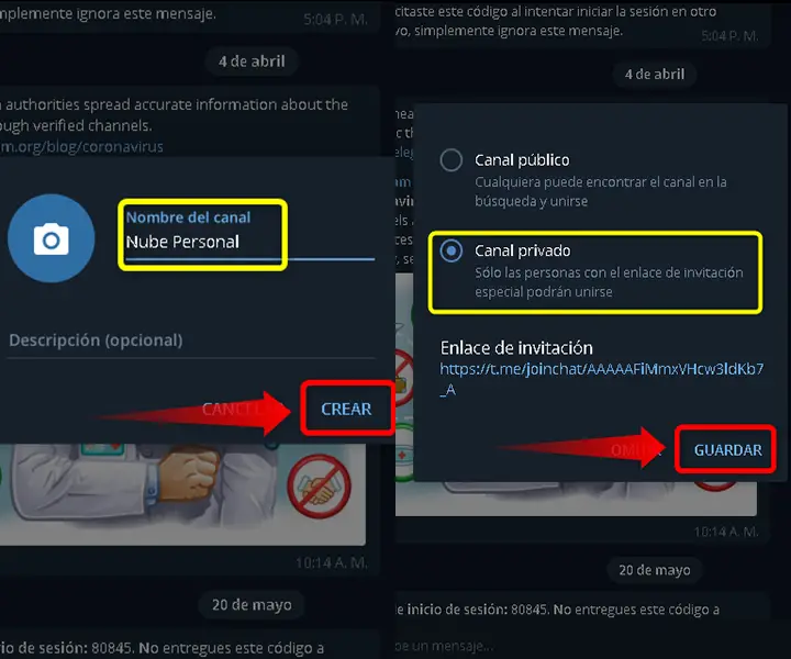 - Enregistrez la modification et sélectionnez s’il s’agira d’une chaîne publique ou privée. Sélectionnez «Chaîne privée» si vous voulez créer une chaîne pour télécharger ce que nous voulons et être utilisée comme une sorte de cloud dans Telegram.