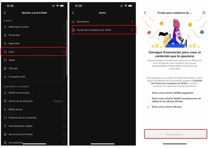 - Si vous respectez les règles et les exigences du « Fonds des créateurs », un outil spécial appelé « Auteur » s’ouvrira. Entrez dans cette section et vous verrez «Fonds pour les créateurs TikTok», appuyez dessus.