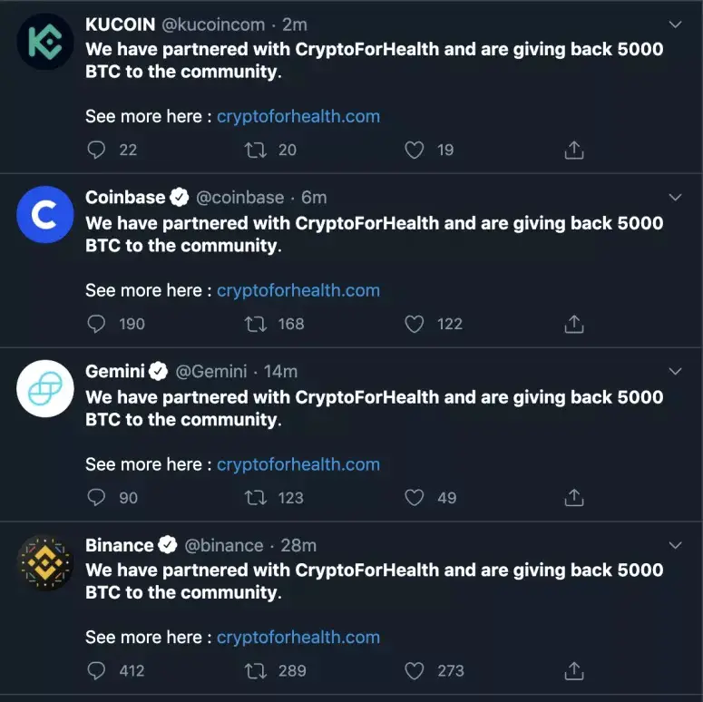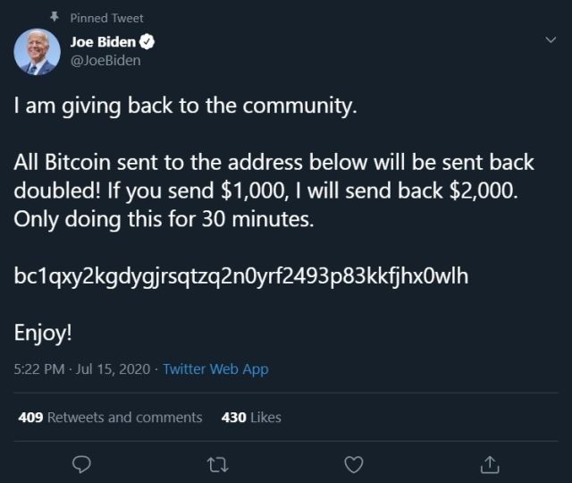 Évidemment, je ne peux pas vous assurer qu’il s’agissait de l’attaque la plus grave, mais au moins elle est en passe de l’être avec l’ ensemble du personnel des influenceurs concernés, y compris non seulement les comptes personnels mais aussi des entreprises importantes comme Apple, Binance, Uber ou Tesla. , qui font la publicité d’une arnaque qui prétend collecter des Bitcoins pour une cause caritative.