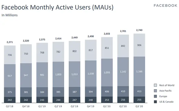 En premier lieu, à la fin du troisième trimestre 2020, Facebook a atteint 1820 millions d’utilisateurs actifs quotidiens , ce qui représente une augmentation de 35 millions par rapport à la période précédente. Et ce total représente une augmentation de 12% d’une année sur l’autre, même si bien sûr, l’augmentation du nombre d’utilisateurs ne se comporte pas de la même manière dans tous les pays où elle est présente: aux États-Unis et au Canada, il y a une légère baisse depuis le deuxième trimestre 2020, tandis que L’Asie-Pacifique et l’Inde poursuivent leur croissance accélérée.