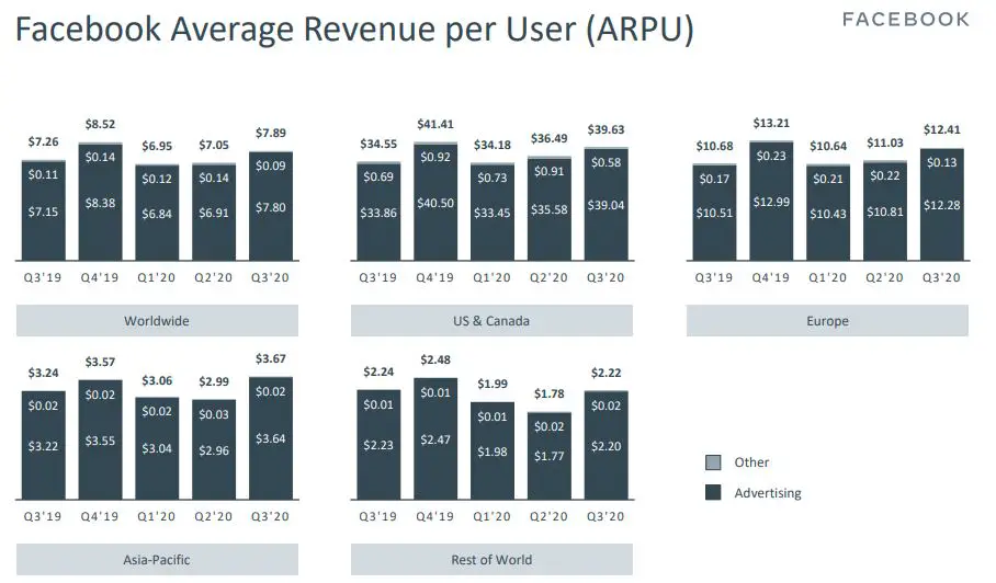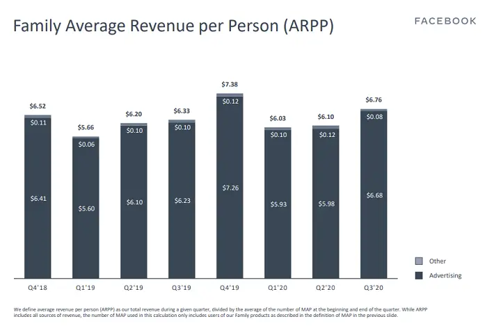 Facebook a également fourni ce graphique qui montre le revenu par personne dans sa famille d’applications: au cours du troisième trimestre 2020, il a généré 7,89 $ par utilisateur, soit 6,76 euros. Dans l’ensemble des autres marques du groupe, les résultats sont quelque peu inférieurs: