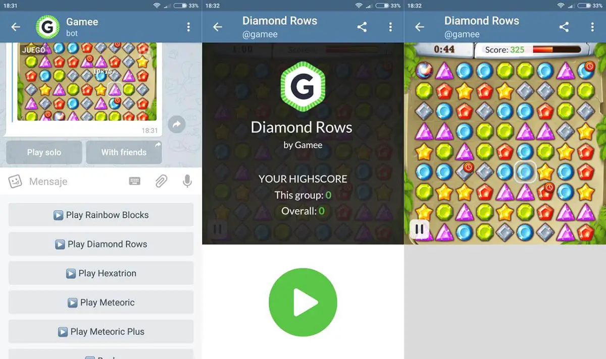 Diamond Rows est un jeu similaire à Candy Crush que vous pouvez apprécier sur Telegram avec le bot gamee. La meilleure chose à propos de ce jeu est que vous n’avez pas besoin de demander des vies à personne sur Facebook, vous pouvez donc jouer autant que vous voulez et quand vous voulez. Brillant!