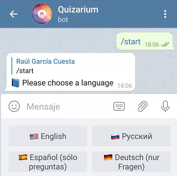 Quizarium est un jeu Telegram idéal pour les amateurs de questions et réponses. Le bot pose des questions et les participants doivent répondre dès que possible. C’est sans aucun doute un excellent outil de distraction pour jouer avec vos amis lorsque vous vous ennuyez. Pour y jouer, il suffit de cliquer sur la loupe qui apparaît sur l’écran principal de Telegramb et de taper Quizarium dans le moteur de recherche.