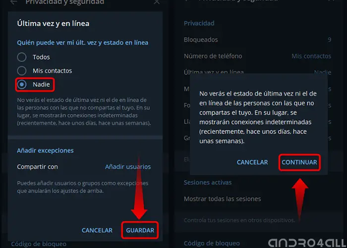 En suivant ces étapes dans la configuration de Telegram, aucun utilisateur ne pourra voir votre statut en ligne et vous ne verrez pas non plus le statut ou les heures de connexion des autres. Si vous acceptez les conditions, il est temps de masquer votre statut en ligne et d’appliquer le mode invisible dans Telegram.