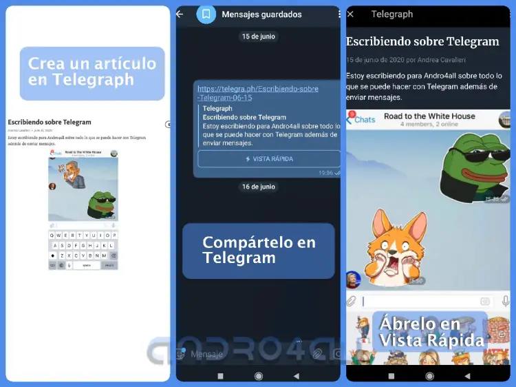 Les publications créées sur Telegraph sont partagées sur Telegram, via des canaux ou un message, créant ainsi des pages d’affichage instantané magnifiquement conçues.