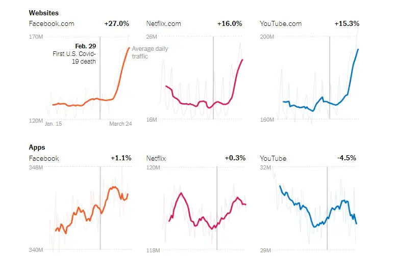 La quarantaine et le confinement massif de près de la moitié de la population mondiale nous ont tous obligés à utiliser nos PC pour travailler, jouer et se connecter à domicile, ce qui a fait que les plateformes Web de services populaires telles que Netflix, YouTube ou Facebook ont ??énormément augmenté en ce qui concerne les applications et appareils mobiles des mêmes services.