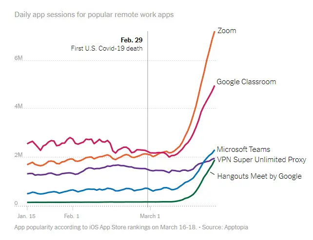 En fait, le graphique de l’utilisation des principaux outils de télétravail aux États-Unis montre qu’en effet le virus nous a tous fait passer à une salle de classe virtuelle ou à un bureau en ligne pour étudier et travailler à domicile, avec également une croissance énorme dans ce qui précède Zoom, Google Classroom, Microsoft Teams ou Hangouts Meet.
