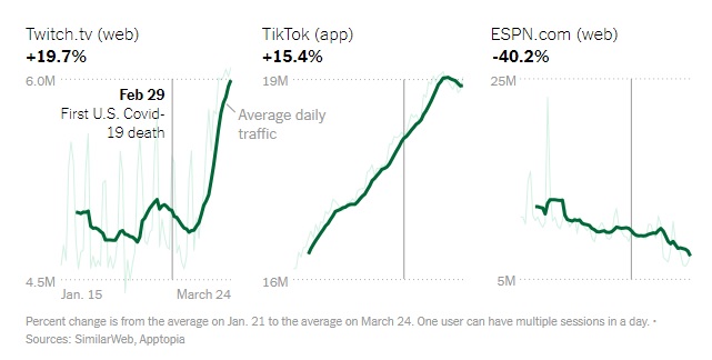 Les graphiques le démontrent clairement, avec une croissance exponentielle à partir de la mi-février des versions web des principaux services en ligne.