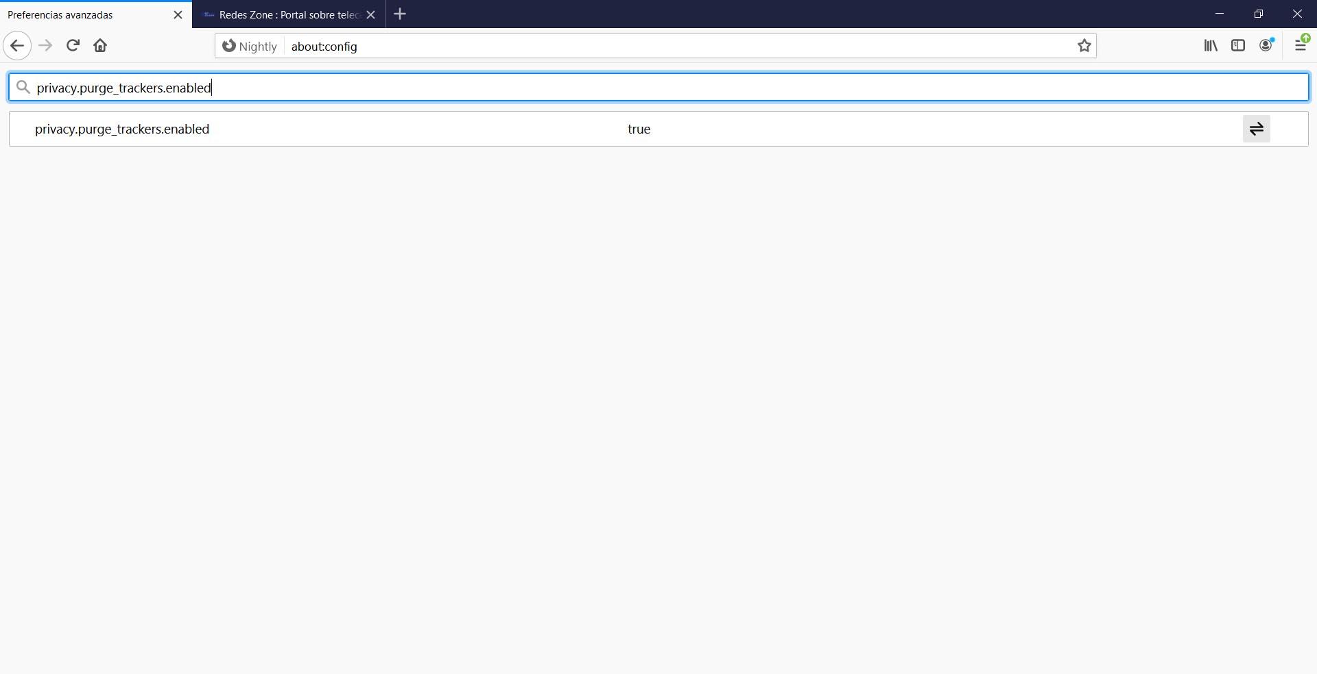 L’activation de cette protection dans Firefox est très simple. Pour ce faire, accédez à about: config dans le navigateur (nous acceptons les risques) et recherchez privacy.purge_trackers.enabled . Pour activer cette fonction, définissez la valeur sur True.