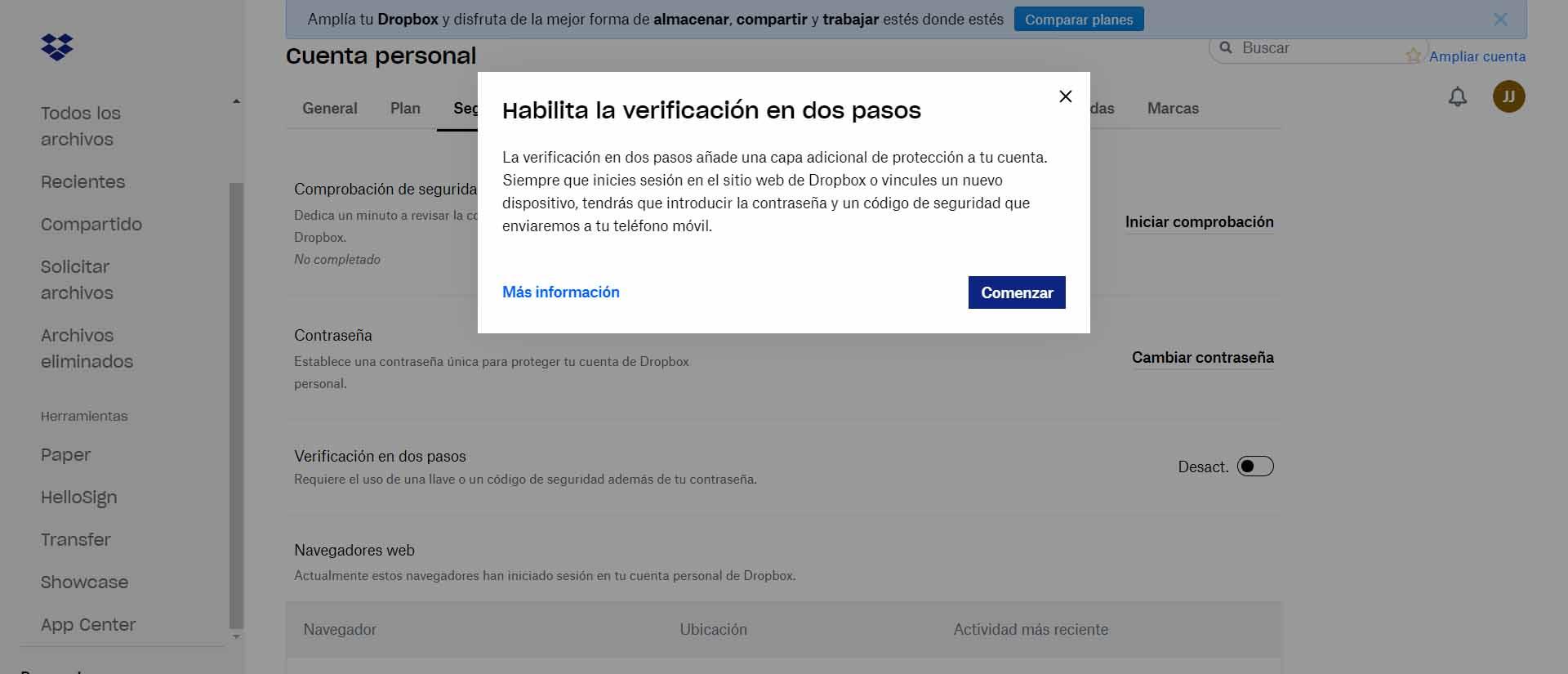 Quant à Dropbox, c’est très similaire. Cette fois, nous nous connectons au site officiel , cliquez sur l’avatar ou l’icône en haut à droite, Paramètres, Sécurité et dans Vérification en deux étapes, nous activons et suivons les étapes.