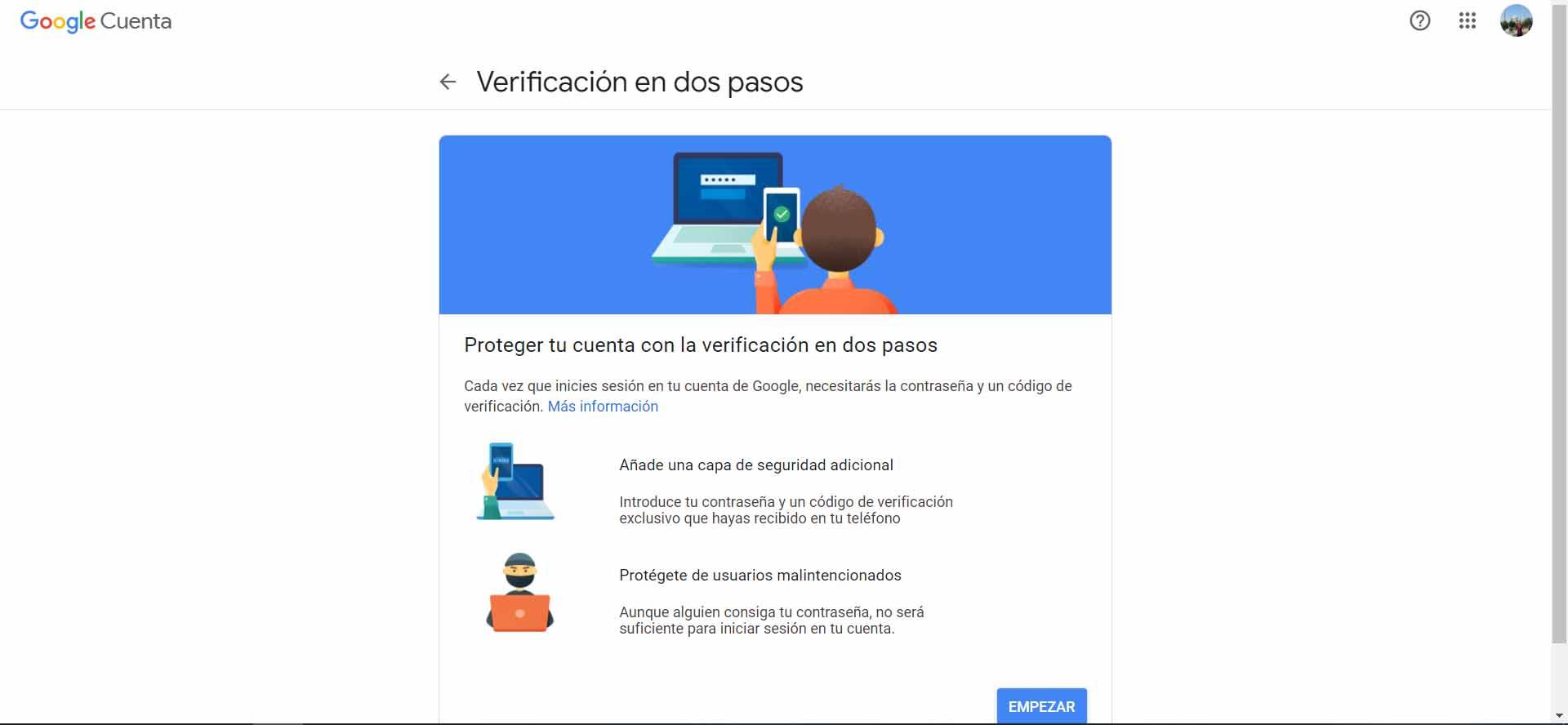 Dans le cas de Google Drive, nous devons ouvrir notre compte Google , nous entrons dans la section Sécurité, Connectez-vous à Google et là nous verrons Vérification en deux étapes. Nous devons l’activer. Nous suivons les étapes et le configurons comme nous le souhaitons.