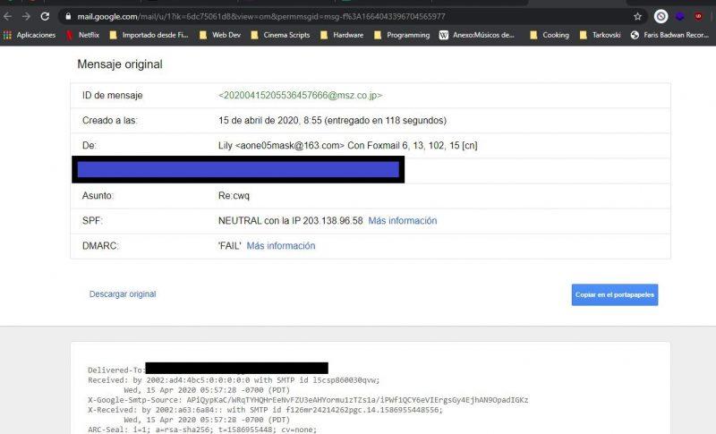 Ci-dessous, vous verrez un texte très détaillé. Bien qu’il suffira d’insister sur certaines sections. Ainsi, vous pouvez facilement vérifier si le message que vous avez reçu a un expéditeur modifié ou non. Tout d’abord, allons au bas de la page et voyons le «De» . N’oubliez pas qu’il s’agit de l’expéditeur du message.