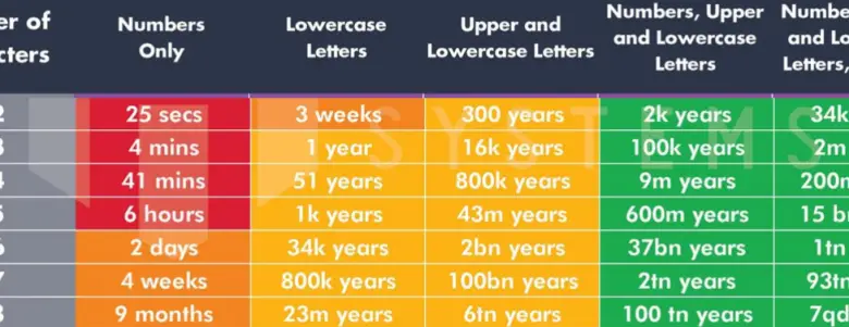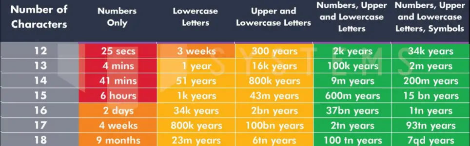 La société de cybersécurité Hive Systems nous montre un tableau très complet du temps qu’il faut pour déchiffrer un mot de passe. Dans ce tableau, nous pouvons voir que nous avons beaucoup d’informations sur la façon dont la longueur de la clé affecte et aussi sa complexité.