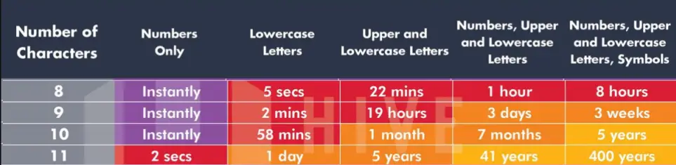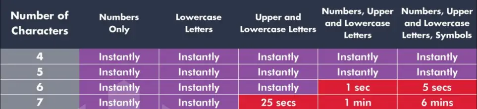 Les mots de passe composés de 4 à 7 caractères sont les plus faibles. Comme nous pouvons le voir ci-dessous, leur utilisation n’est pas fortement recommandée. Sur la base du tableau ci-dessus de Hive Sytems, nous en avons réduit le contenu afin que nous puissions le prendre comme exemple. Ainsi, il serait comme suit :