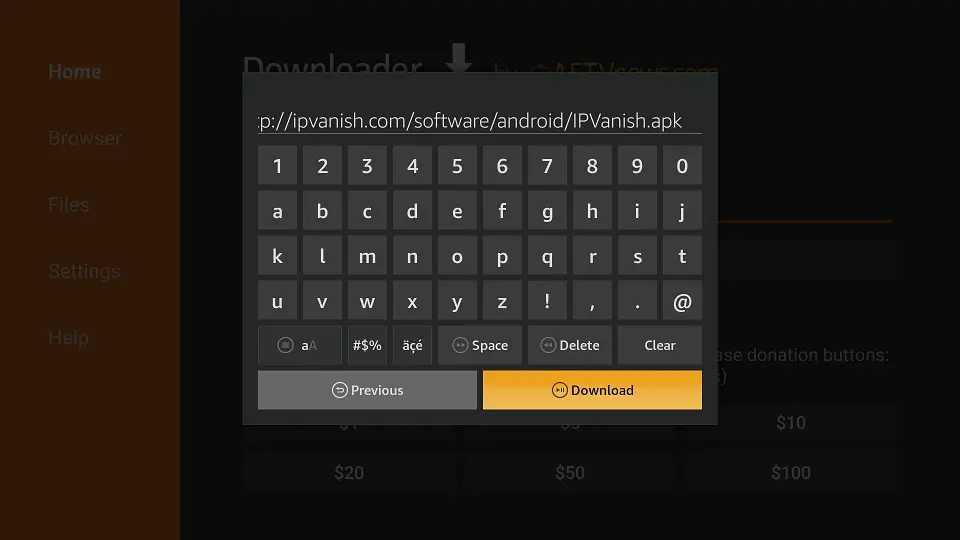 - Entrez l’URL suivante dans la zone de texte Downloader: https://www.ipvanish.com/software/android/IPVanish.apk