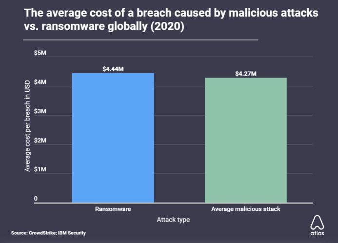 Une attaque de malware en moyenne coûte aux entreprises 4,27 millions de dollars par attaque. Cependant, avec une attaque de ransomware, vous obtenez 4% de plus, soit une moyenne de 4,44 millions de dollars par attaque.