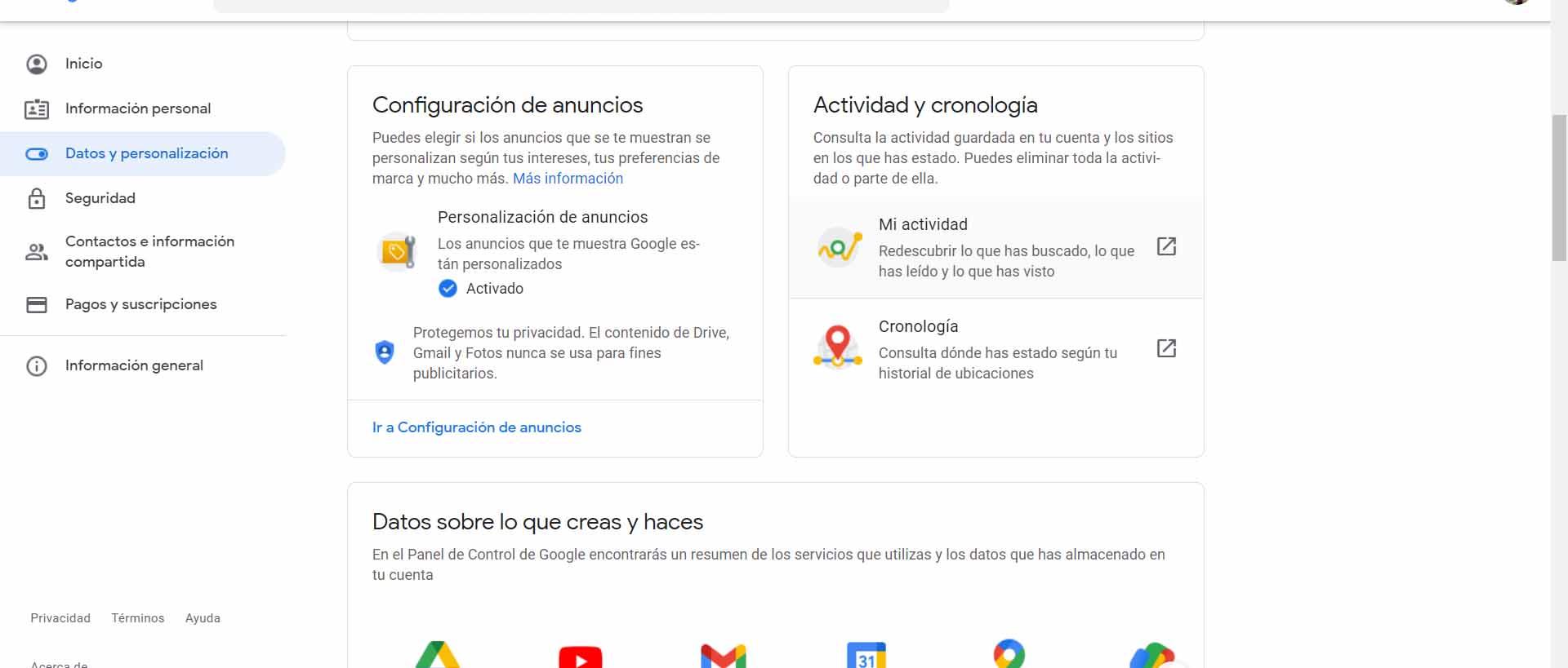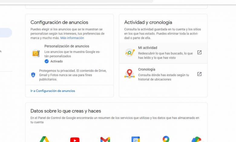 Par la suite, dans le menu de gauche, vous devez cliquer sur Données et personnalisation. C’est la troisième option qui apparaît. Nous devons descendre jusqu’à ce que nous voyions Activité et chronologie. Là, vous devez cliquer sur Mon activité .
