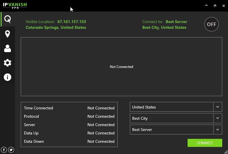 Tout d’abord, ouvrez IPVanish. Votre écran devrait ressembler à ceci: