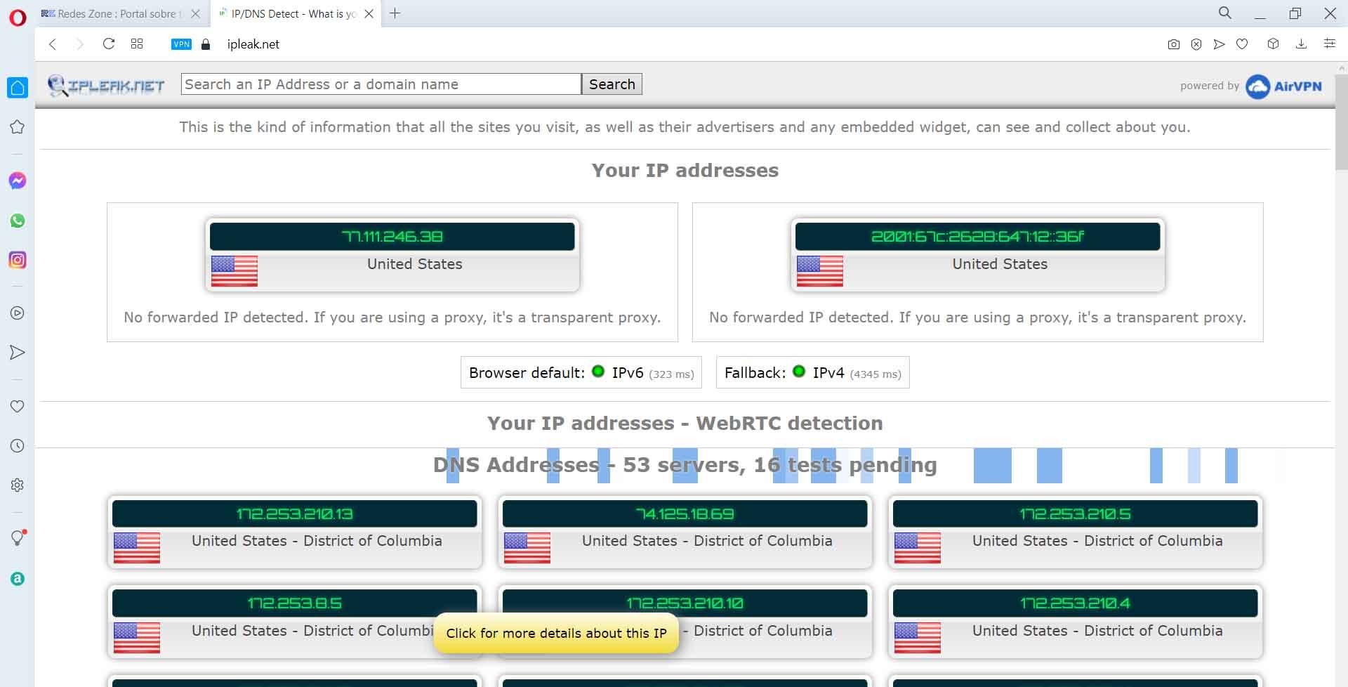 Dans notre cas, avec un VPN configuré cette fois pour simuler être aux États-Unis, il semble que nous soyons dans ce pays. Comme on peut le voir, il nous dit que tout est correct et qu’il n’y a aucun type de fuite qui pourrait nuire à la vie privée.