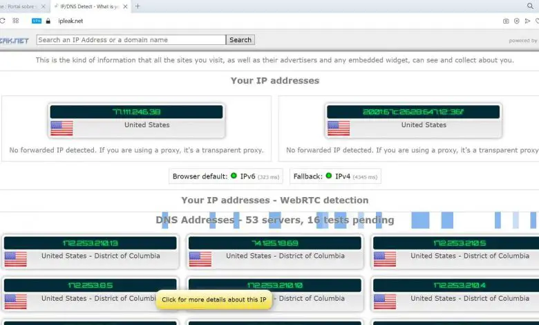 En ce sens, nous avons un large éventail de possibilités. Nous pouvons utiliser différents outils qui sont sur Internet et qui sont gratuits. Son fonctionnement est très simple, puisqu’il ne nous indique que le DNS que nous utilisons, ainsi que l’emplacement où nous nous trouvons. Si, par exemple, nous sommes en Espagne mais que nous avons installé un VPN pour simuler que nous sommes en Allemagne et que lors d’un test, il semble que nous soyons en Espagne, quelque chose ne va pas.