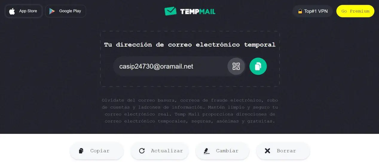 Le service Temp Mail est l’un des plus faciles à utiliser, nous entrons sur le Web et sur l’écran principal, nous verrons l’e-mail temporaire qu’il a généré, et juste en dessous, nous pouvons voir la boîte de réception des e-mails, le tout sans avoir besoin de s’inscrire.