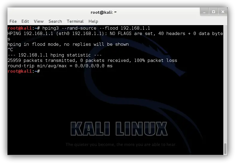 L’outil occupera environ 3 600 Ko qui, une fois installé, nous pourrons commencer à l’utiliser. Il existe des distributions Linux sur lesquelles ce programme Hping3 est déjà installé par défaut, comme Kali Linux, la distribution populaire orientée vers les audits de sécurité où nous aurons ceci et des dizaines d’autres outils afin de vérifier la sécurité de différentes cibles et d’exploiter différentes vulnérabilités.