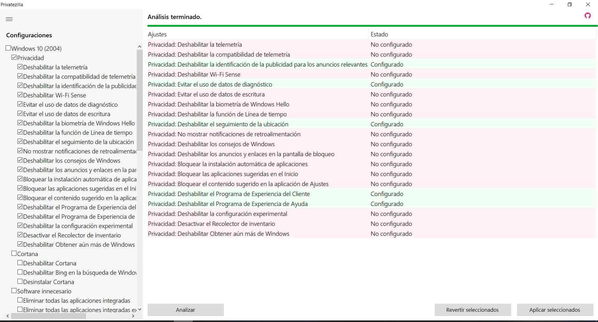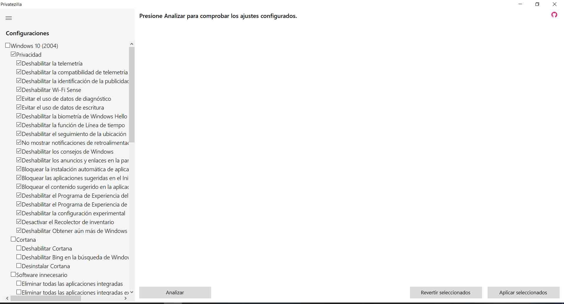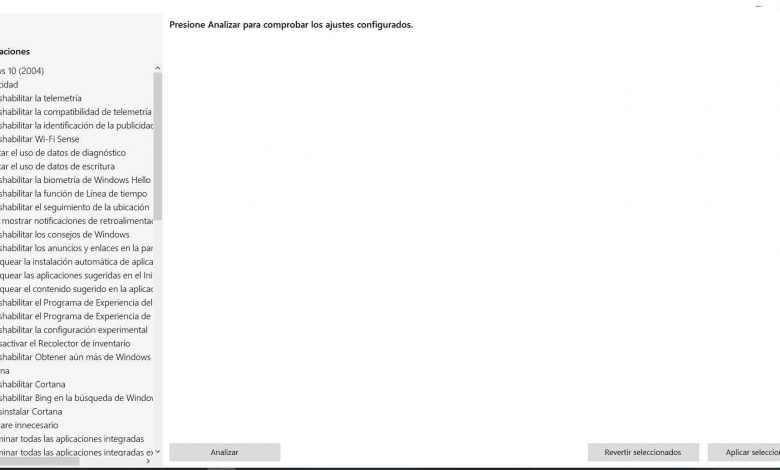 Lorsque nous l’ouvrirons, nous trouverons une première fenêtre où nous pourrons marquer ou décocher ces options. Une fois que nous avons sélectionné ceux qui nous intéressent, nous pouvons cliquer sur Analyser. Comme vous pouvez le voir, nous avons des centaines d’options de configuration et nous les classons par différents sujets, tels que les problèmes liés à la confidentialité, avec cortana, la suppression des logiciels inutiles et bien plus encore. Par conséquent, si nous voulons uniquement désactiver cortana, nous choisirons simplement les options qui lui sont associées.