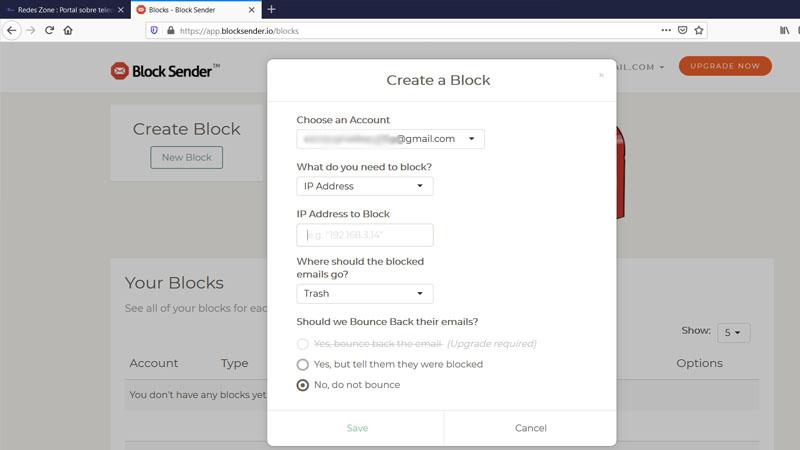 Nous devons appuyer sur Blocks et New Block . Là, nous devons choisir l’adresse que nous voulons (ce sera celle que nous avons liée, au cas où nous n’en avons mis qu’une), ainsi que remplir ce que nous voulons bloquer (adresse IP, dans ce cas). Nous pouvons également choisir où nous voulons que le courrier aille (par exemple, à la corbeille). Nous devons mettre l’adresse IP que nous avons obtenue plus tôt.