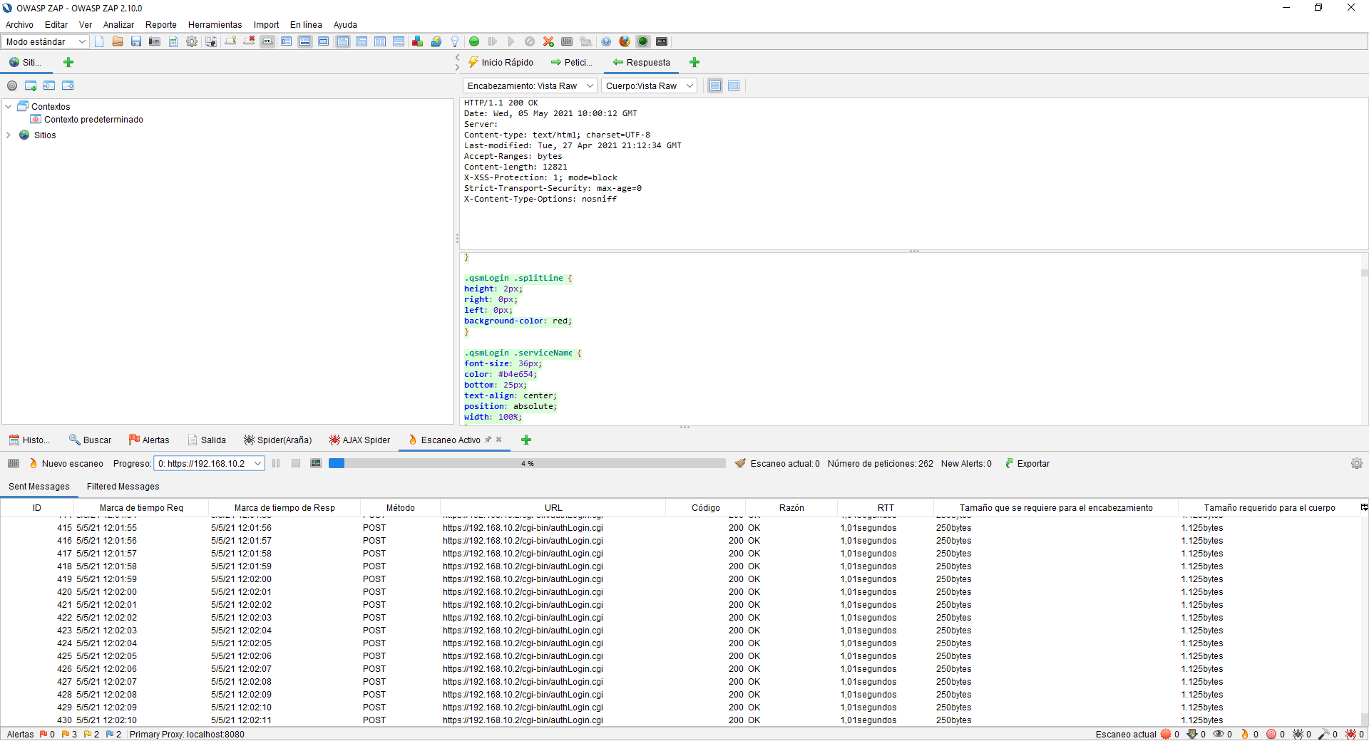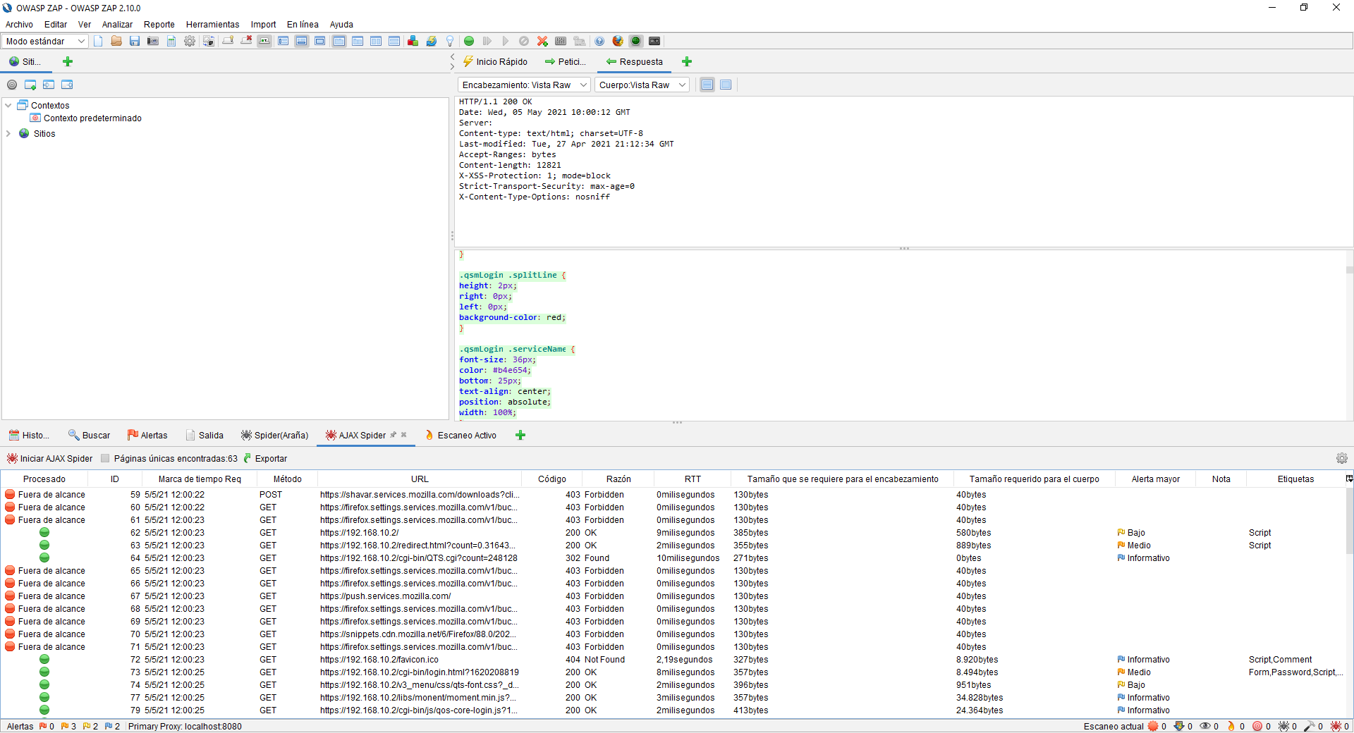 Dans notre cas, nous avons attaqué le serveur Web d’un serveur NAS QNAP mis à jour vers la dernière version. Nous pourrons voir de nombreuses requêtes GET et POST du service HTTP / HTTPS lui-même. Dans la partie inférieure gauche, nous verrons toutes les alertes que nous avons, en cliquant sur chacune d’elles, nous pouvons voir dans la partie droite quel type de vulnérabilité ou d’erreur nous avons localisé, et dans la partie supérieure, nous verrons tout brut.