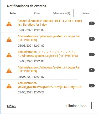 Dans le cas de QNAP, lorsqu’il détecte que quelqu’un essaie de faire une connexion ratée à plusieurs reprises, il nous mettra automatiquement sur la liste noire, par conséquent, nous devons prendre en compte les protections d’un serveur web, soit par le pare-feu L7 que nous ont configuré, l’IDS/IPS qui détectera le trafic anormal etc.