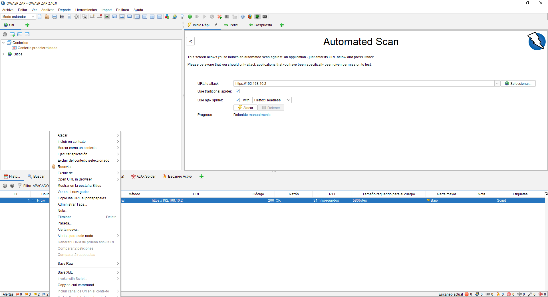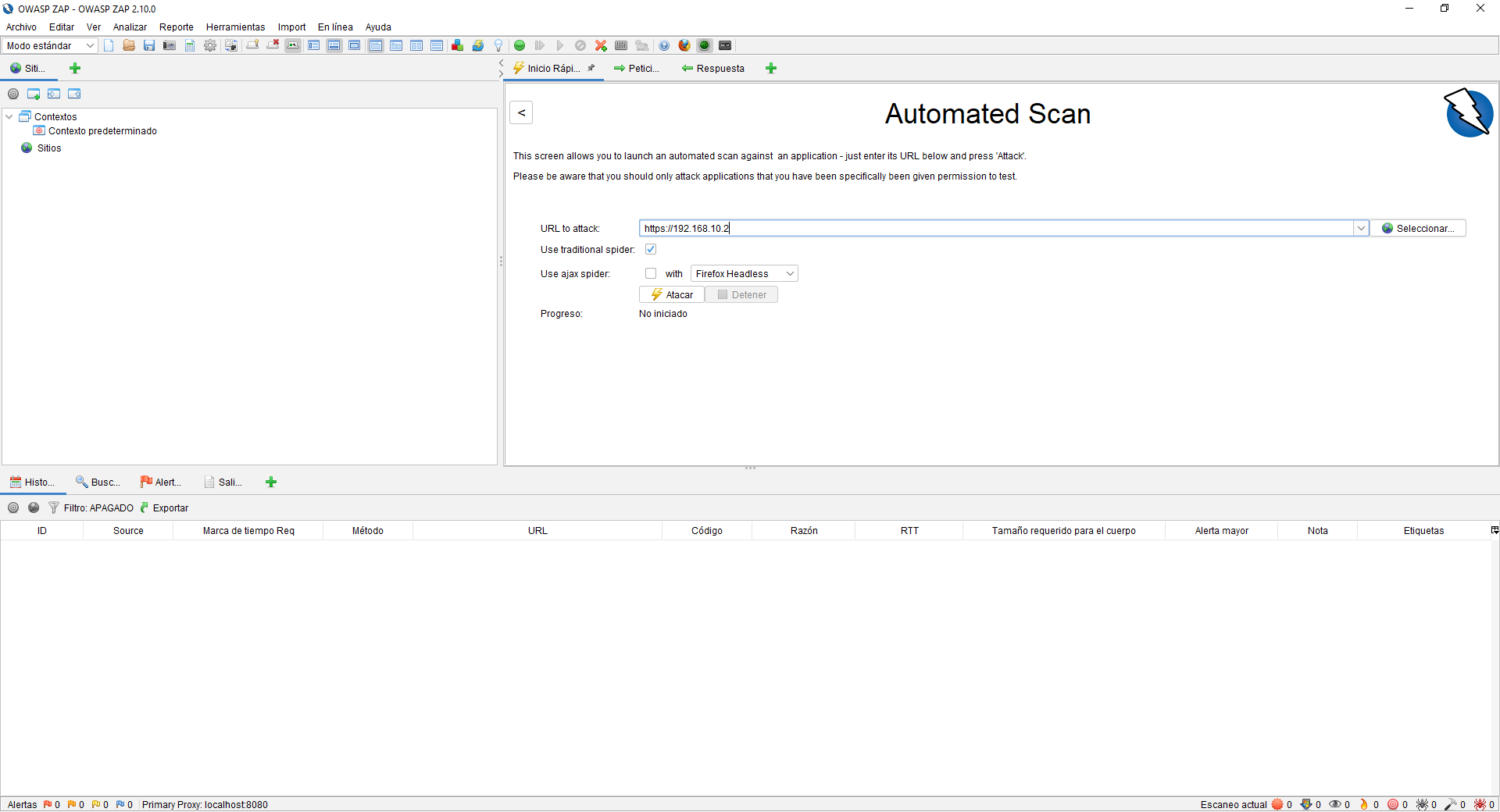 Si nous cliquons sur «Analyse automatisée», nous pouvons effectuer une analyse automatisée vers l’URL que nous voulons, nous pouvons attaquer n’importe quelle URL, soit avec une adresse IP, soit avec un domaine, un détail très important, c’est que nous devrons avoir l’autorisation pour effectuer ce type d’audit, et le faire avec précaution car les alertes d’attaques web pourraient sauter dans l’IDS/IPS que nous avons configuré, et aussi dans le mod_security de notre serveur Apache etc.