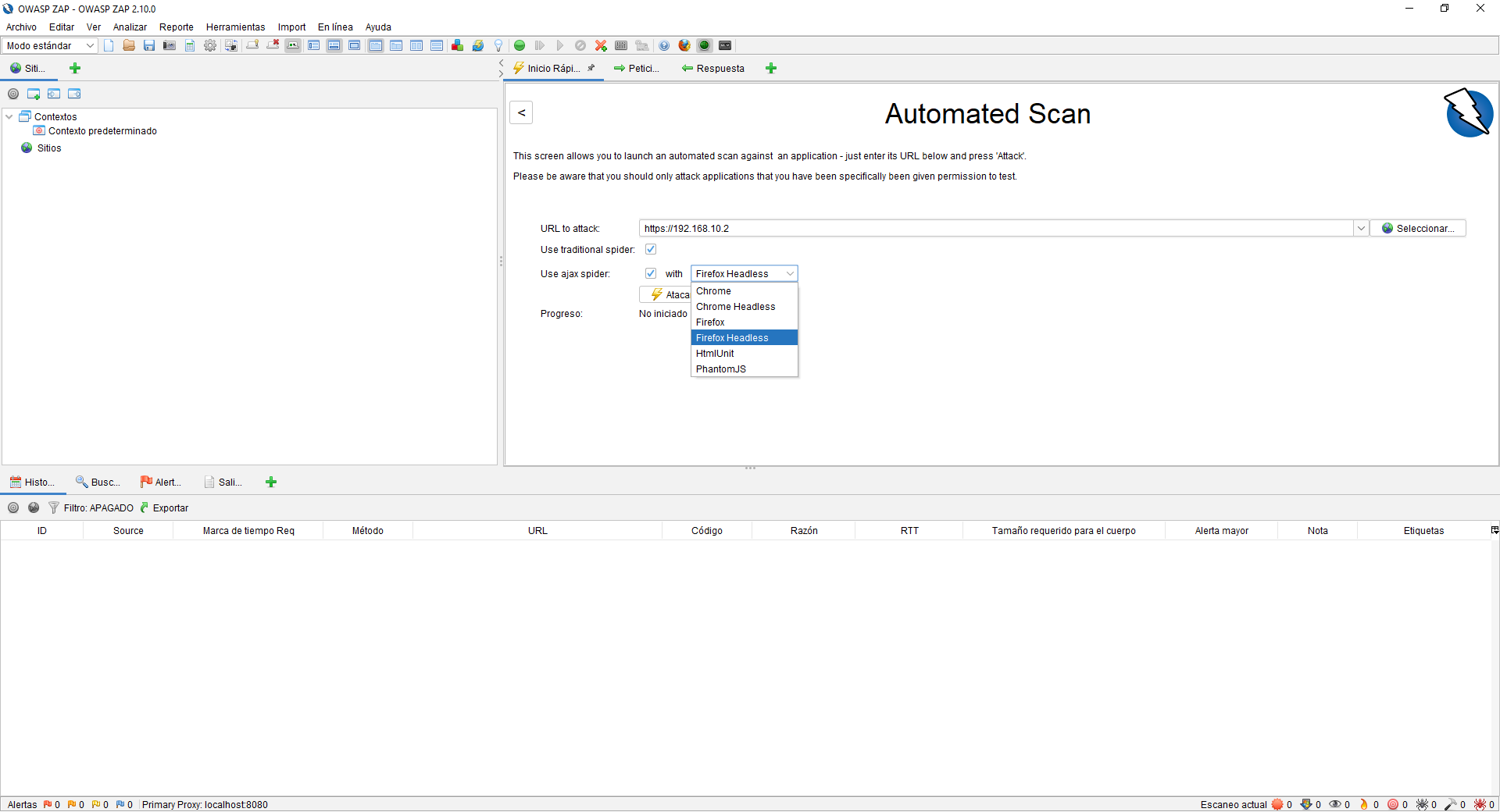 Nous aurons la possibilité d’utiliser un spider traditionnel ou Ajax, en plus, nous pourrons utiliser les profils de Chrome, Firefox entre autres. Une fois que nous avons tout configuré, nous cliquons sur «Attaquer» et il commencera à analyser l’ensemble du serveur Web en faisant des requêtes GET et POST pour détecter d’éventuelles vulnérabilités dans l’application.