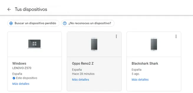 Si nous voulons faire une vérification, la première chose que nous ferons est d’entrer notre compte Google. Nous allons à la section Sécurité , Gérer les appareils . Il nous donnera les informations suivantes :