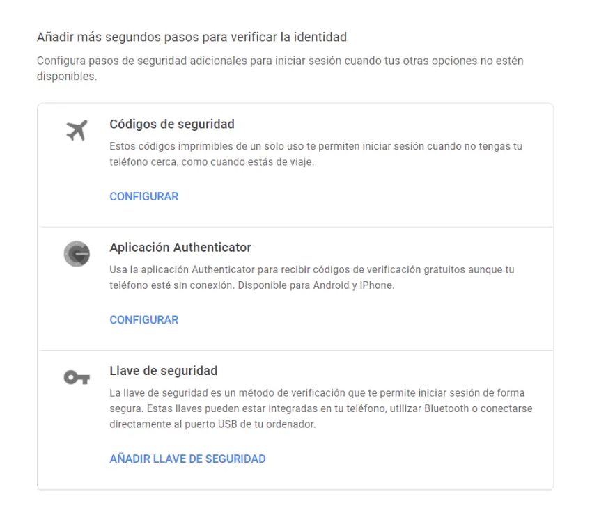 Il est également possible qu’au final vous ne soyez pas convaincu par la vérification en deux étapes de Google. Une des raisons que nous pourrions trouver serait, par exemple, que cela prend du temps lorsque vous vous connectez à certaines occasions. Une autre peut être due au fait que vous rencontrez parfois des problèmes lors de l’utilisation de la vérification en deux étapes et que cela vous empêche d’accéder à votre compte. Et c’est peut-être même parce qu’à un certain moment, vous travaillez uniquement à domicile et vous pensez que vous n’avez pas besoin d’autant de sécurité pour une saison.