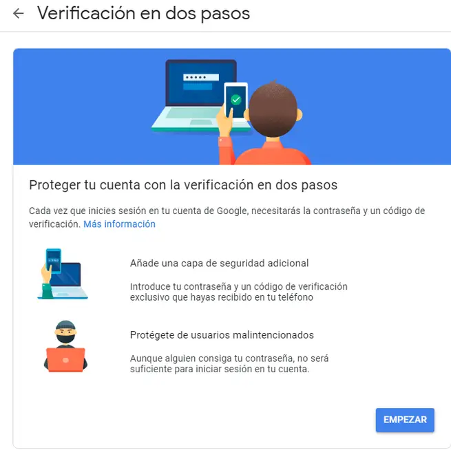 La vérification en deux étapes nous protégera des utilisateurs malveillants même s’ils ont notre mot de passe. Il s’agit d’ajouter une défense supplémentaire à votre compte Google pour éviter d’être piraté. Lorsque quelqu’un vole notre mot de passe, il peut bloquer votre accès à notre compte. En outre, il pourrait supprimer tout votre contenu, usurper notre identité et utiliser le compte pour réinitialiser les mots de passe d’autres comptes que nous utilisons.