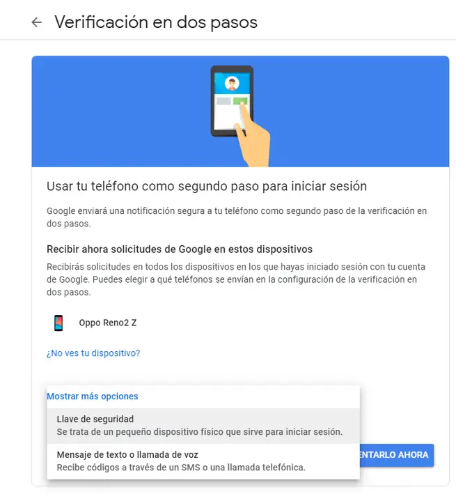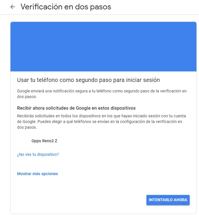 Dans la première partie nous choisirons l’appareil qui contrôlera la vérification en deux étapes. Par défaut, il vous attribuera celui de votre smartphone principal. Dans ce cas, Google a détecté le bon grâce au fait que mon numéro de téléphone est enregistré dans le compte. Ensuite, vous pouvez également cliquer sur «Afficher plus d’options»: