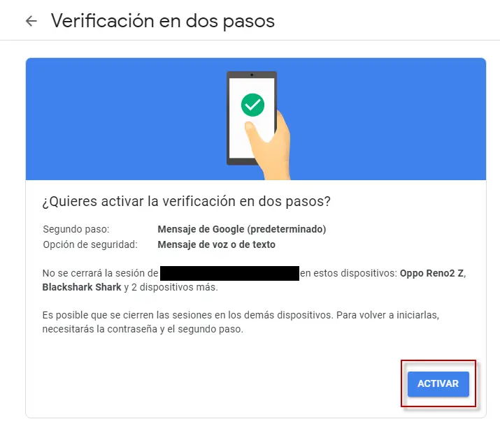 Pour terminer la vérification en deux étapes de Google, il suffit de cliquer sur Activer . Désormais, nous avons une couche de sécurité supplémentaire qui protège notre compte Google.