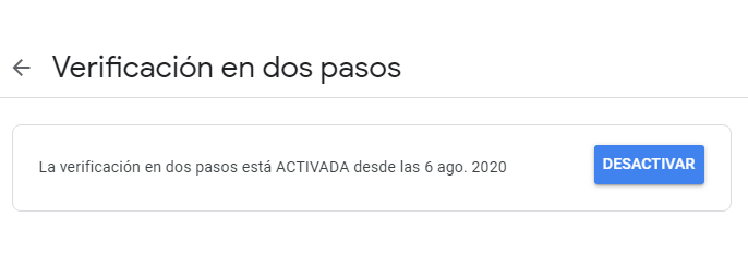 Si nous cliquons à nouveau sur « désactiver », le processus sera terminé. Ensuite, à partir de ce moment, seul notre mot de passe sera notre barrière de protection. Une façon de vérifier s’il a été désactivé est de saisir à nouveau notre compte Google. Là, lors de la connexion, dans la section Vérification en deux étapes, nous verrons : Non.