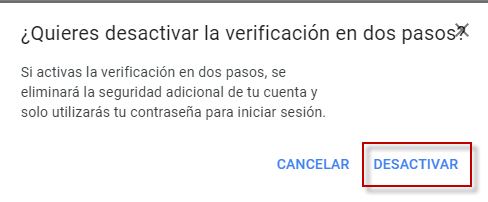 Si nous cliquons sur Désactiver, nous lancerons le processus pour arrêter d’utiliser la vérification en deux étapes de Google. Mais avant de la laisser désactivée, cette affiche apparaîtra avec un avertissement :