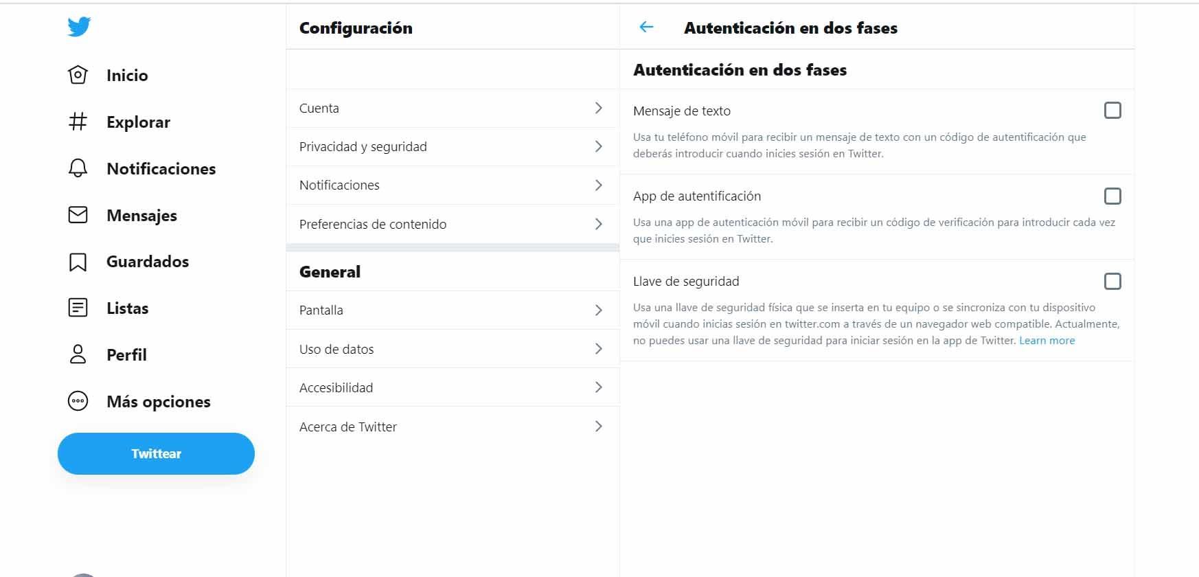 Pour activer l’authentification en deux étapes sur Twitter, vous devez accéder à notre profil, entrer Plus d’options et accéder aux Paramètres et à la confidentialité. Une fois ici, nous donnons le compte, la sécurité et l’authentification en deux phases.