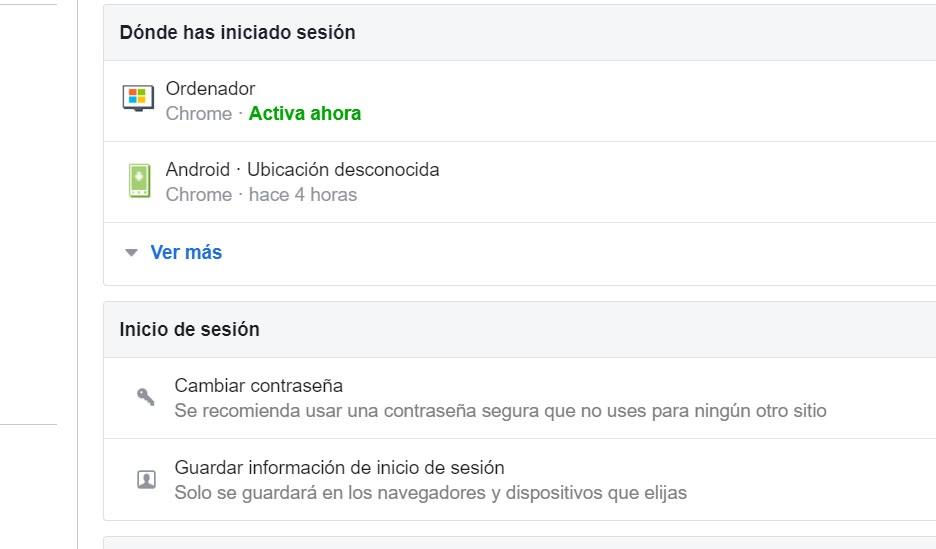 Une autre fonctionnalité que nous pouvons voir dans Paramètres et sécurité est de contrôler les connexions de notre compte. Nous pouvons voir les détails de l’endroit où nous nous sommes connectés, à partir de quel système d’exploitation ou appareil. Cela nous alertera au cas où nous verrions quelque chose d’étrange, quelque chose qui ne devrait pas être présent. Un moyen de tout mettre en ordre.