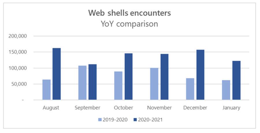 Cette situation ne vient pas de maintenant, il y a un an, il était déjà signalé la forte augmentation de l’utilisation de shells Web dans les attaques dans le monde entier. Dans un rapport de l’équipe de recherche Microsoft 365 Defender, il a révélé que cette tendance, en plus de se poursuivre, s’est également accélérée. Ainsi, d’août 2020 à janvier 2021, 140 000 attaques de shell web en moyenne ont pu être détectées. Si nous l’achetons avec l’année dernière, nous pouvons voir qu’ils sont presque le double depuis lors, la moyenne mensuelle était de 77 000 attaques.