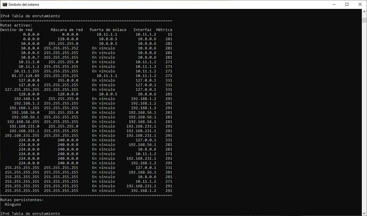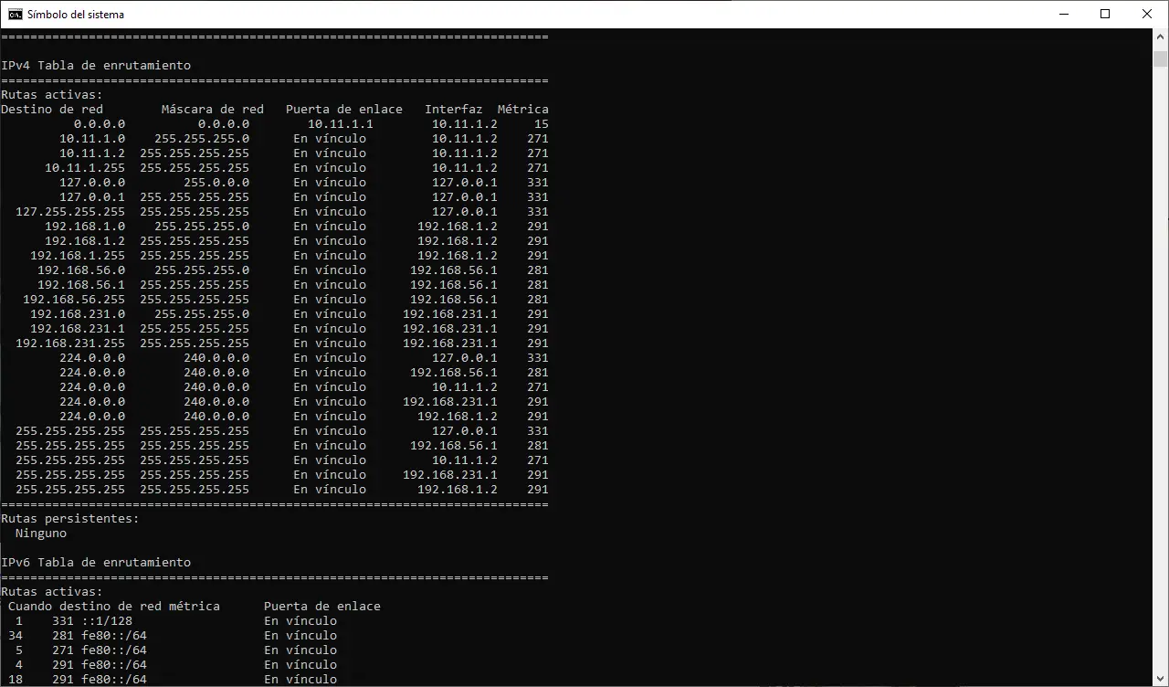Dans la table de routage des réseaux IPv4 ou IPv6, lorsque nous sommes connectés à notre routeur domestique, la passerelle par défaut doit apparaître avec la route correspondante vers l’ensemble du réseau local et les différents sous-réseaux des différentes interfaces réseau dont nous disposons. Comme vous pouvez le voir, la première route transfère tout le trafic à la passerelle par défaut : destination réseau 0.0.0.0 (tout), masque 0.0.0.0 (tout) et la passerelle est 10.11.1.1 qui est notre routeur, et l’interface 10.11.1.2 est notre IP.