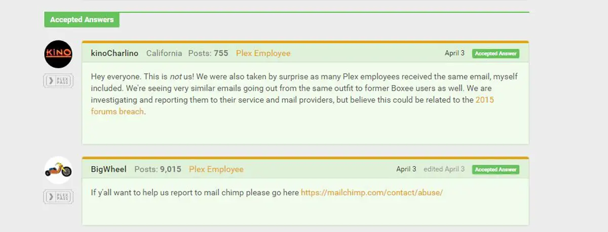 C’était une arnaque . L’utilisateur qui a reçu l’e-mail l’a publié sur les forums en ligne de Plex, où un employé de l’entreprise l’a identifié comme une arnaque. Le vice y a joué un rôle et le service en question a depuis disparu . La conclusion est; cela se produit.