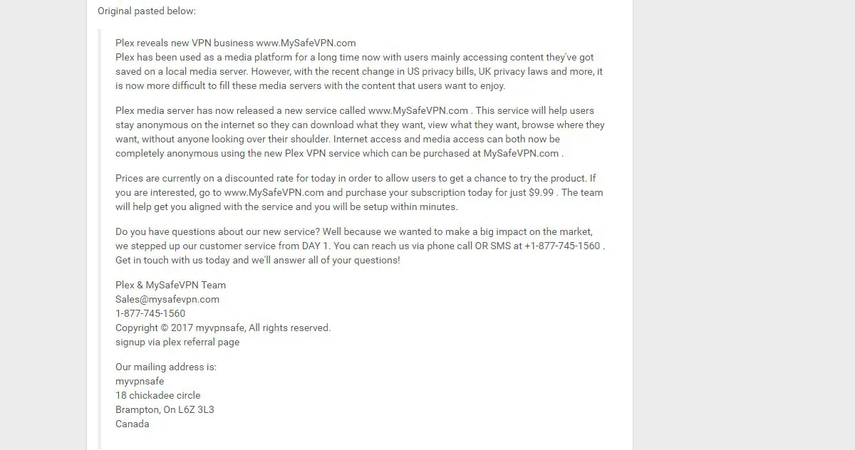 L’équipe Plex et MySafeVPN ont signé l’e-mail. Ce n’était pas une arnaque courante lorsqu’un prince nigérian a tenté de vous envoyer de l’or. Cet e-mail est une chose professionnelle. Il y avait un site Web, une adresse physique appropriée pour l’entreprise et un numéro de téléphone. Vice a fait des recherches pour savoir qui était derrière cet e-mail, mais l’utilisateur moyen n’ira probablement pas aussi loin.